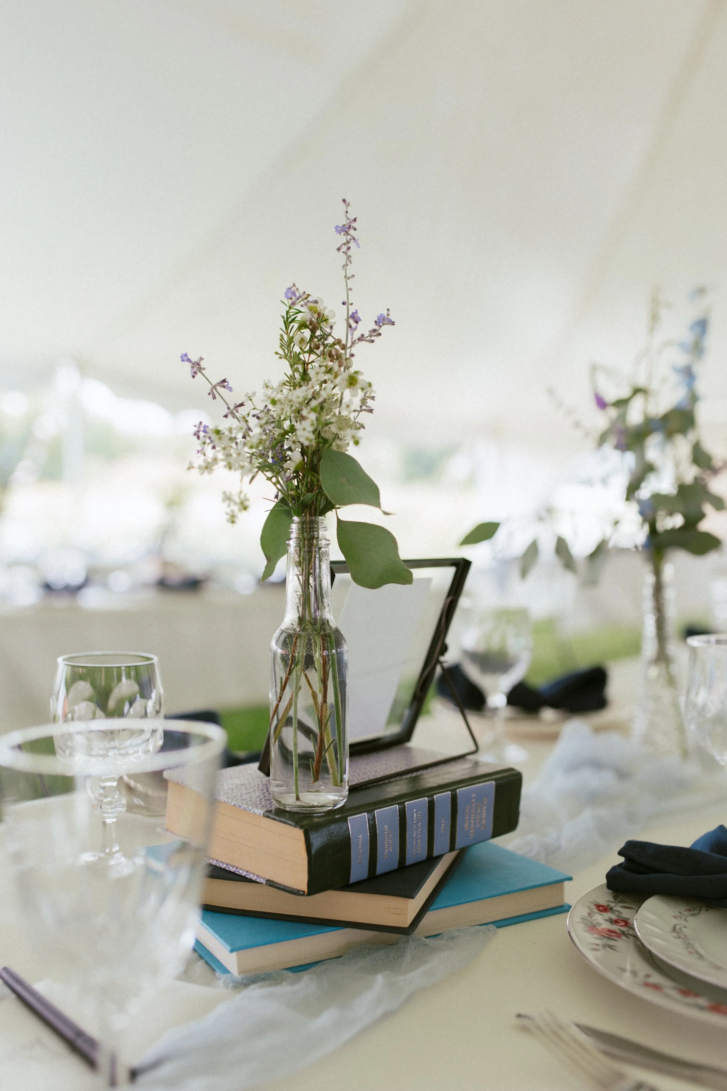 We carry a limited collection of blue and amber glass. This is perfect for a table of 8 or to set apart the head table of bride a groom.